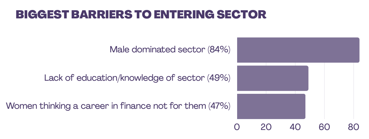 When asked about the biggest barriers preventing more women from entering the personal finance sector, 84% cited it being seen as a male dominated sector.
