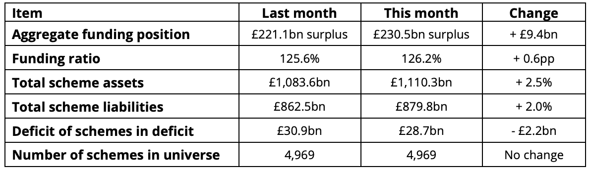 Total scheme assets climbed 2.5% to £1,110bn during the month while total liabilities rose 2% to £863bn.
