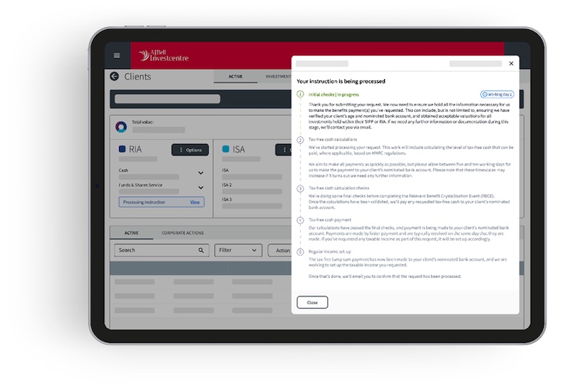 AJ Bell said Financial Planners and advisers will be able to see how many working days have elapsed since they submitted the PCLS request alongside our standard timeframe to make the payment.