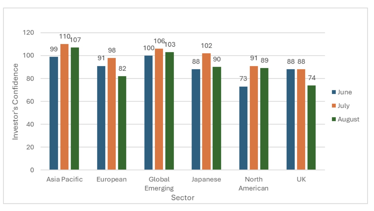 Confidence among investors fell across all regions in August with the UK and Europe worst hit, according to the Hargreaves Lansdown Investor Confidence Index.