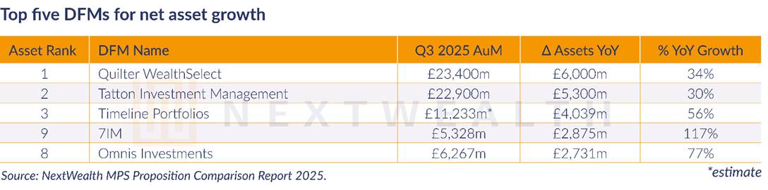 Of the assets added in the past year, £28.6bn was from 10 firms (62% of net growth). The top two ranked firms, Quilter Wealth Select and Tatton, together now control 25% of market assets, NextWealth said.