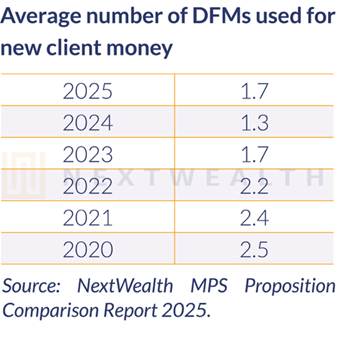 Notably, for the first time in four years, the report also found that advisers have increased the number of DFMs they use. In 2020, advisers were partnering with 2.5 DFMs on average, but by 2024 that had shrunk to 1.3 due to growing complexity and a need for consistency under Consumer Duty. The new report shows the trend reversing, however, with advisers increasing the average number of DFMs used to 1.7.