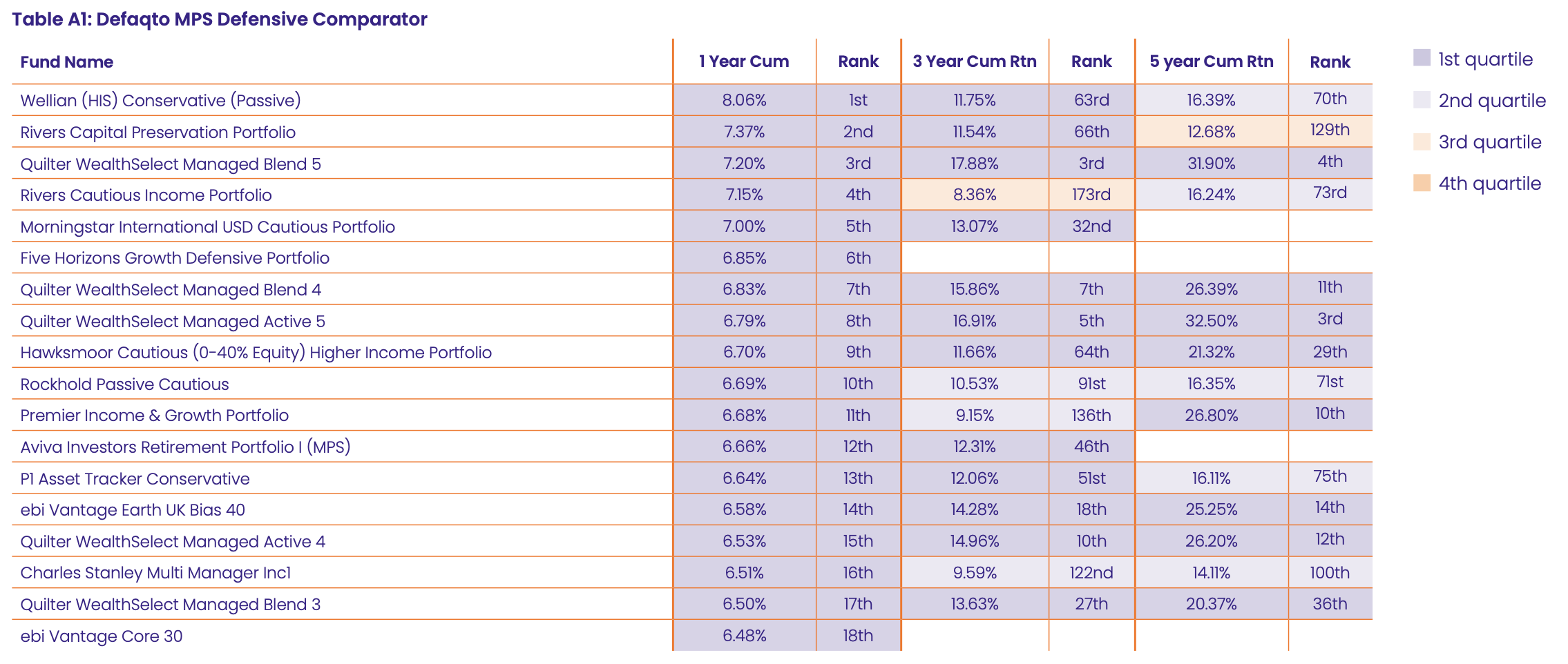 Table A1 shows the cumulative performance over one, three and five years, for each Comparator peer group to the end of May 2025. Source: Defaqto.