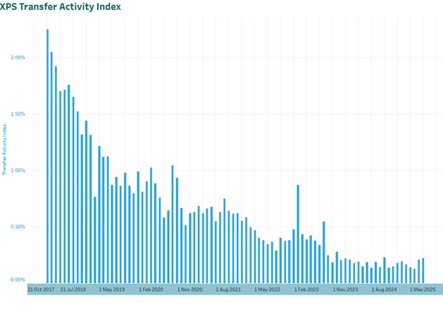 Pension transfer activity - the number of pensions being transferred as measured by XPS internal data - has been falling steadily since 2017.