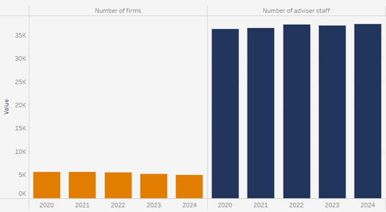 The number of adviser firms providing independent financial advice fell 5% (year-on-year) in 2024, according to data from the latest FCA Retail Intermediary Market Data report out this week.