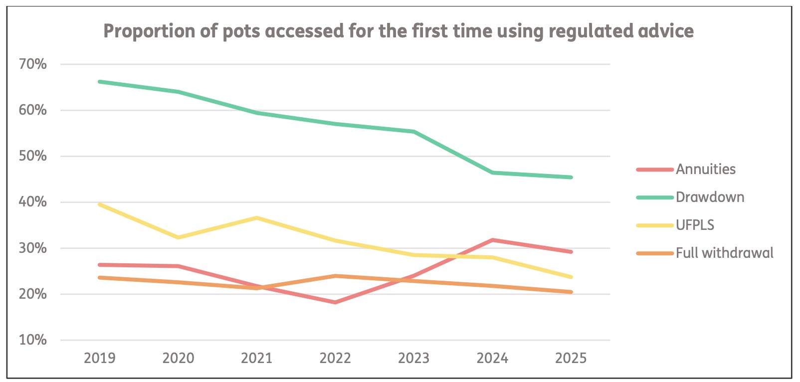 The proportion of savers accessing a pension for the first time using regulated advice has fallen to less than a third according to the latest FCA figures.