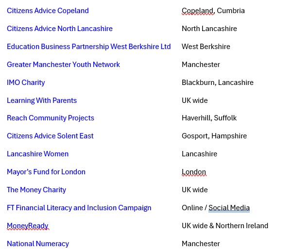 The Charities include Citizens Advice North Lancashire, the Mayor's Fund for London, The Money Charity and the FT Financial Literacy and Inclusion Campaign.