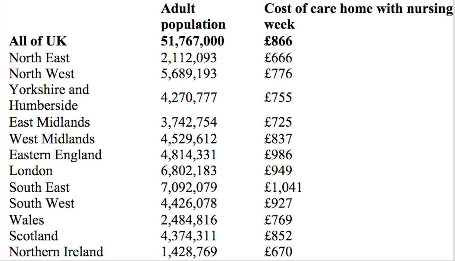 Nursing home costs in the UK per week vary considerably from £666 in the North East and £670 in Northern Ireland to £949 in London and £1,041 in the South East.