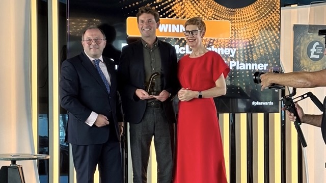 L-R: PFS board member Eddie Grant; Chartered Planner winner Dominic McLoughney; host Sarah Pennells
